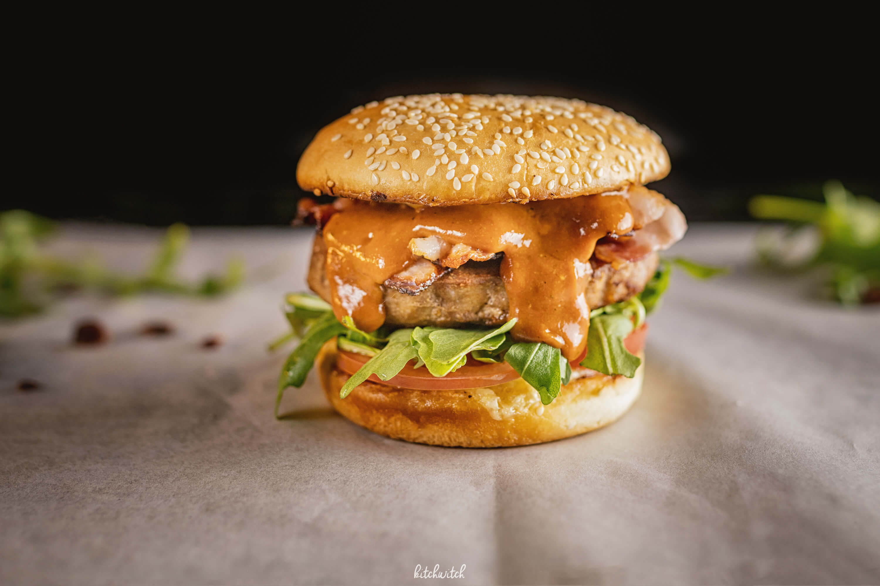 Die Iberico Schweinefleisch-Burgerpattys bei 150 Grad auf dem Grill oder in der Grillpfanne beidseitig je 4 Minuten braten. Die Sesambrötchen ebenfalls auf der Schnittfläche anrösten. Das Spiegelei in einer Bratpfanne mit wenig Fett braten. Das Eigelb mit einer Messerspitze durch das Eiweiss ziehen. Nach 2 Minuten wenden, damit beide Seiten knusprig sind.